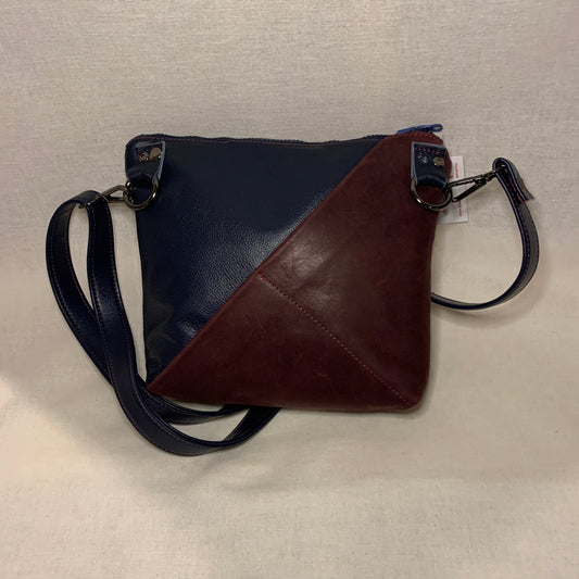 Classically designed all leather crossbody bag with burgundy and navy stripes.