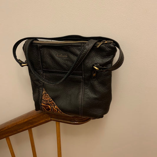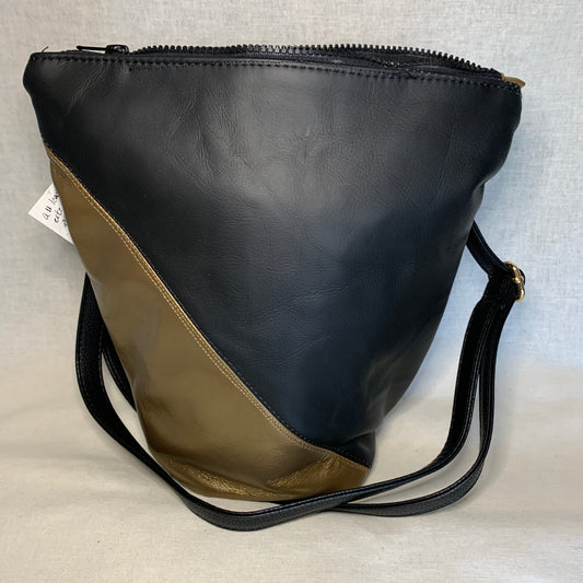 Beautiful black and gold all leather bag with adjustable crossbody strap.