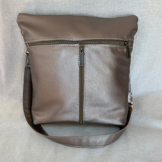 Metallic vinyl crossbody with exterior slip pockets and interior zip pockets.