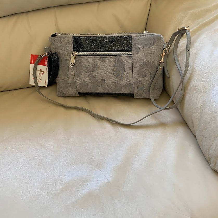 Both attractive and useful, this crossbody can take you from work to dinner. It is understated but stylish with home decor gray on gray fabric with black speckled vinyl contrast. It has one exterior zipper pocket and 2 sets of interior slip pockets. Adjustable gray leather crossbody strap,and stabilizers for durability and strength,