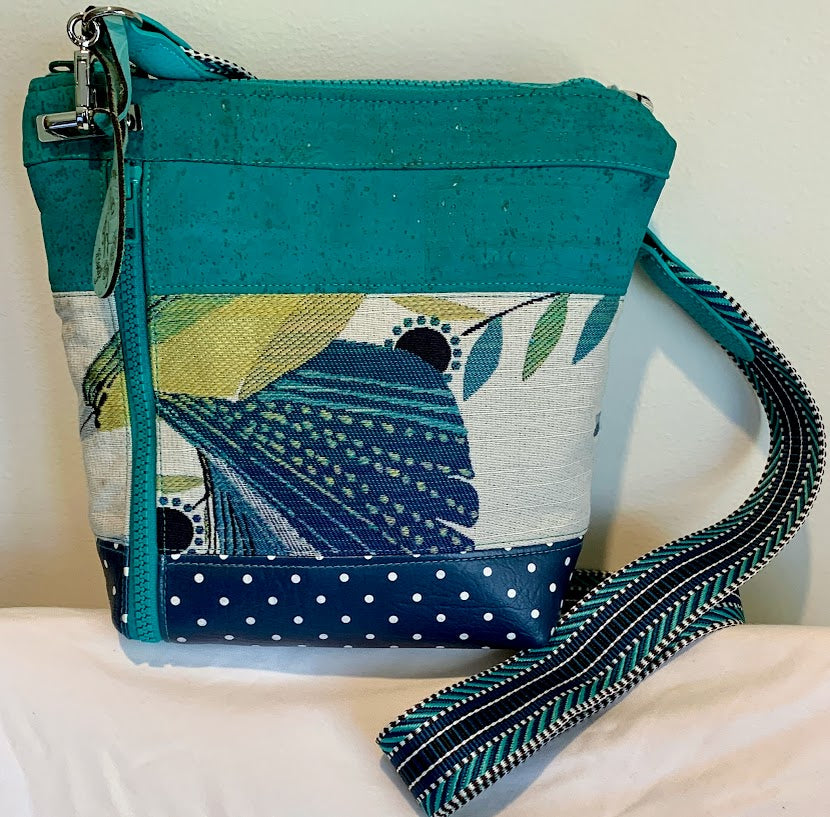 Bright, colorful, unique small crossbody in shades of teal, turquoise and blue.