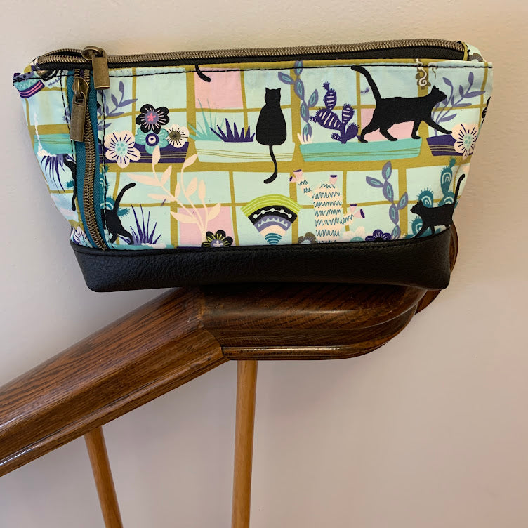 An exterior zip pocket and generous interior make this bag useful for many occasions. The cat motif is colorful and fun.